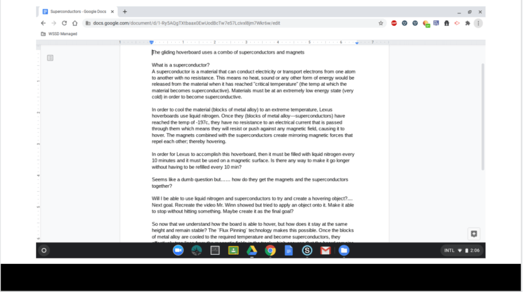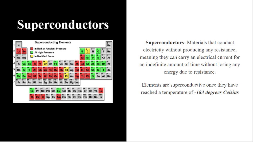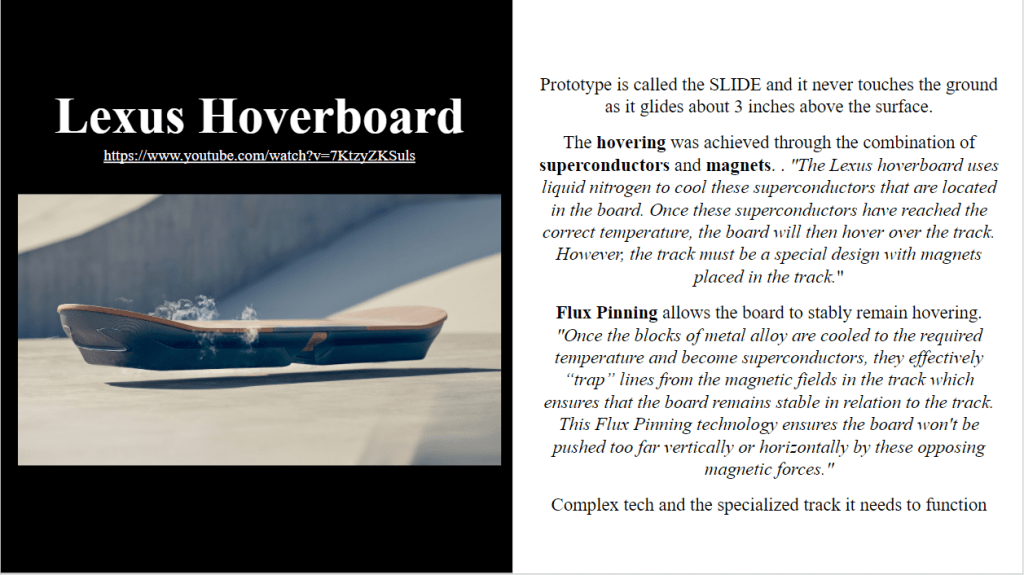 Looking back at my blogs I forgot about my research into the Lexus Hoverboard! It was very interesting to look back at it and actually understand the terms and concepts that I didn’t a few months ago! Pictured below are the slides I created today as I tried to trim down the information about the hoverboard to fit onto one slide. The other two slides are the notes I had taken throughout my research thus far and how my project moved from focusing on magnetic shopping carts to electromagnets to electrical and magnetic fields and finally to the Lexus hoverboard and superconductors. The creation of the hoverboard involved magnets and liquid nitrogen cooling superconductors. What are superconductors you ask? The last slide summarizes just that.
