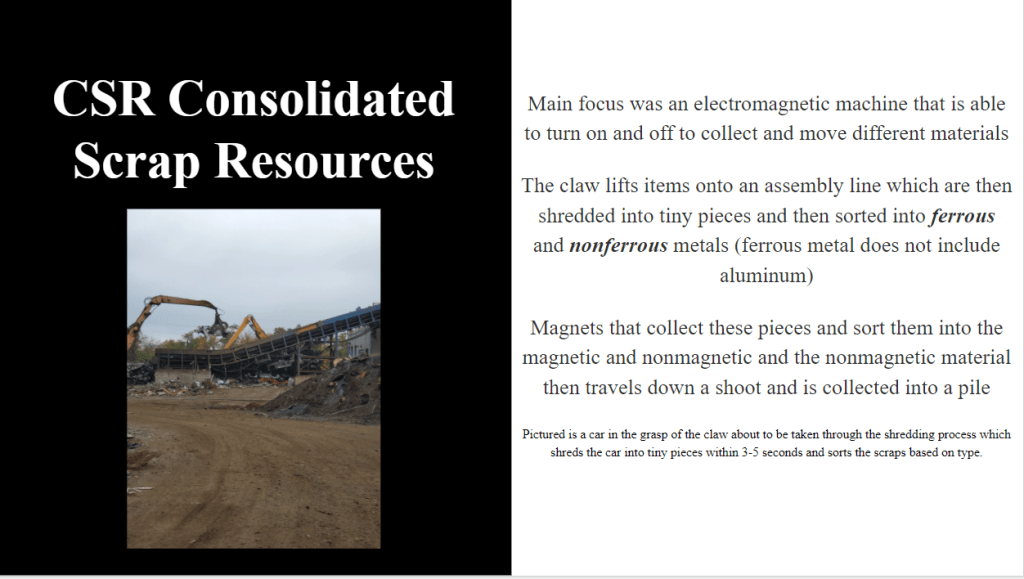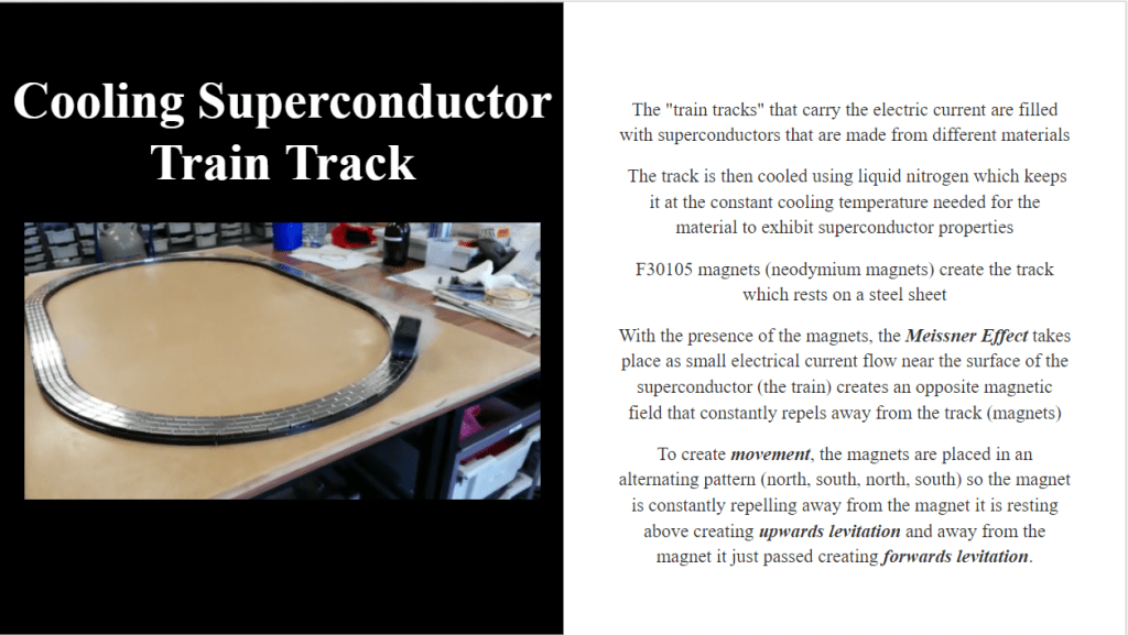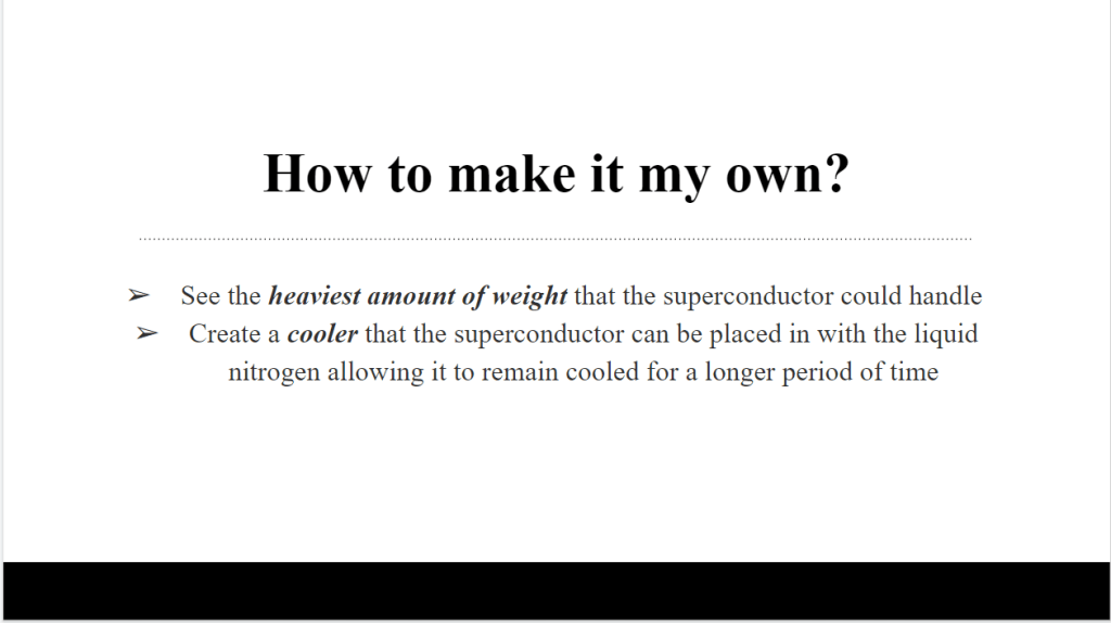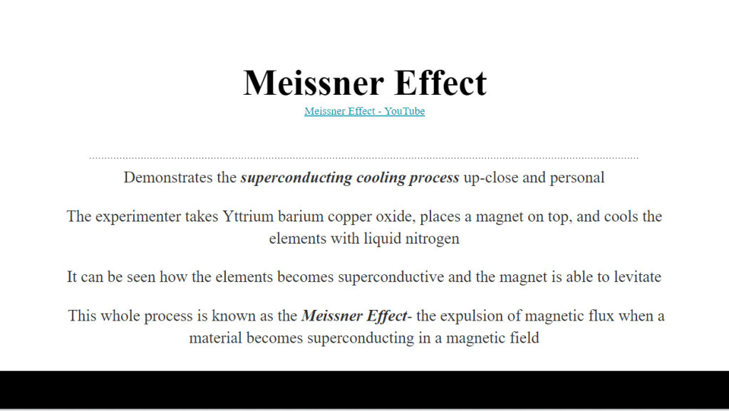 Before finding the experiment I wanted to create (Cooling Superconductors), I had to learn about the Meissner Effect which is shown in the first slide. The next few slides are the summarization of what my project is and how I planned on creating my own twist. As you could have already guessed, it was unsuccessful due to the difficulty of finding the material and the pricing but I am now able to explain to someone what electromagnets are and the process of cooling superconductors which to me, is a great success. As my final page to wrap up the presentation, I added information about our trip to CSR which I included as my source.